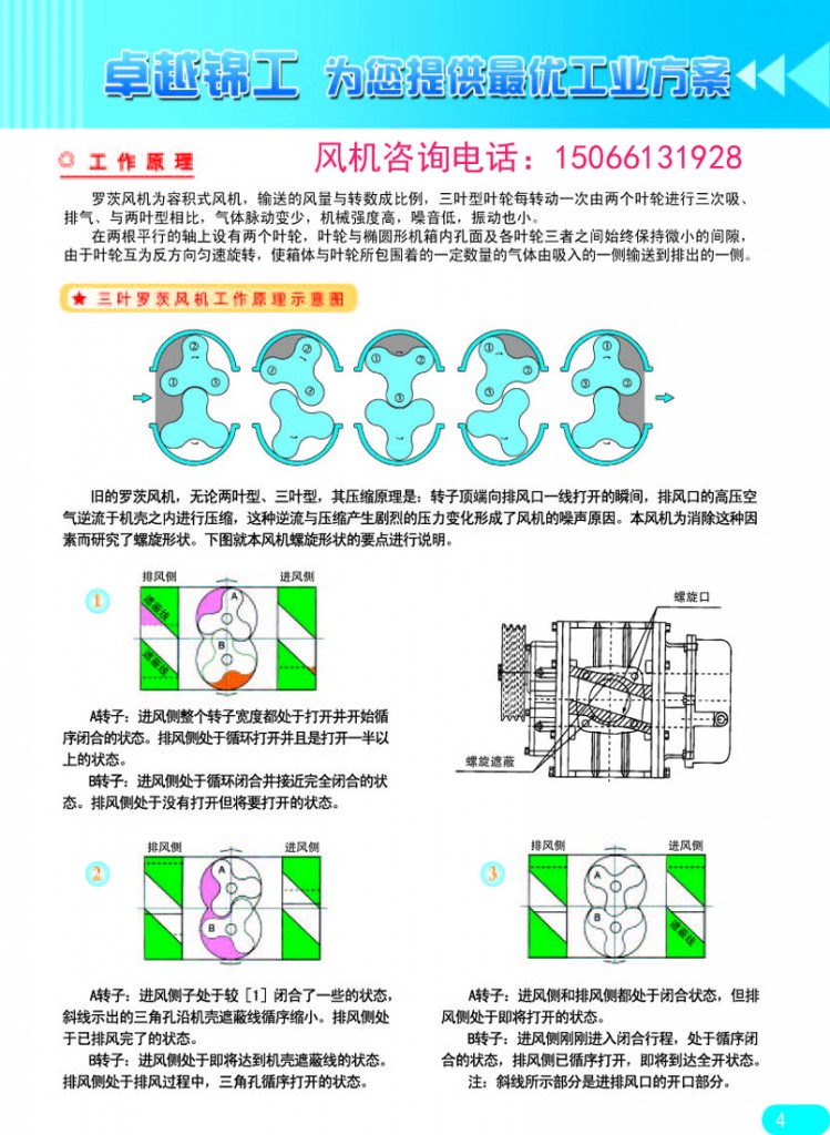 羅茨鼓風機屬于容積式風機,輸送的風量與轉數成比例, 三葉羅茨鼓風機原理是:三葉型葉輪每轉動一次由 2 個葉輪進行 3 次吸、排氣,與二葉型相比,氣體脈動變少,負荷變化小,機械強度高,噪聲低,振動也小。在 2 根平相行的軸上設有 2 個三葉型葉輪,輪與橢圓形機箱內孔面及各葉輪三者之間始終保持微小的間隙,由于葉輪互為反方向勻速旋轉, 使箱體和葉輪所包圍著的一定量的氣體由吸入的一側輸送 到排出的一側。各支葉輪始終由同步齒輪保持正確的相位, 不會出現互相碰觸現象,因而可以高速化,不需要內部潤滑, 而且結構簡單,運轉平穩,性能穩定,適應多種用途,已運用于廣泛的領域。2什么是羅茨風機