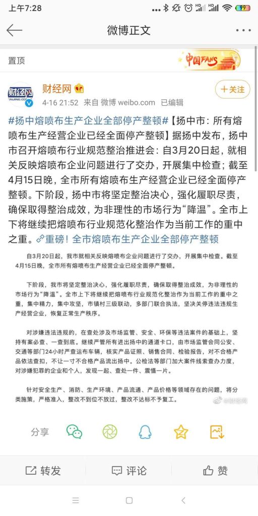 國家出手總是那么及時(shí),這兩天國內(nèi)部分地區(qū)集中整頓熔噴布市場上了熱搜,國家已經(jīng)開始整治熔噴布亂象了,下一步,安評、環(huán)評、衛(wèi)生一卡可能好多小工廠都不能生產(chǎn)了,已經(jīng)能看到有小作坊甩賣生產(chǎn)線的了,對應(yīng)的那些手續(xù)齊全標(biāo)準(zhǔn)要求嚴(yán)格的企業(yè)則會更加如魚得水,熔噴布整治短期內(nèi)價(jià)格不好降,有兩級分化的可能,但短期內(nèi)大幅降價(jià)幾無可能。