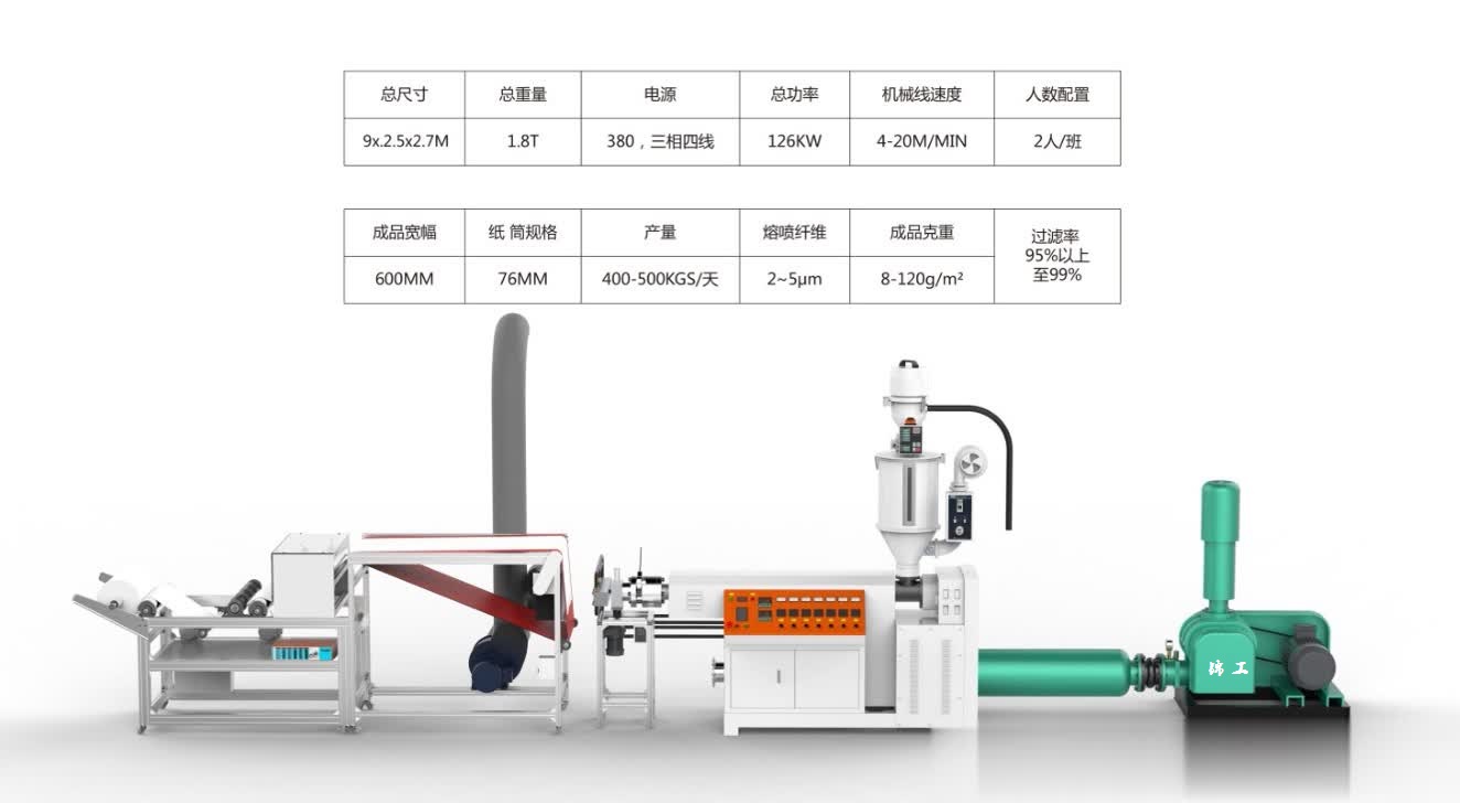 目前市場上面的設備大小生產(chǎn)線比較多,從300到3200mm寬幅都有,配置也是有很大的區(qū)別,熔噴布設備主要核心部件在于: ?羅茨鼓風機,空氣加熱器,自動吸料烘干機,單螺桿擠出機,過濾器,熔體計量泵,噴絲模頭,接布臺,靜電駐極機,切布及卷布。